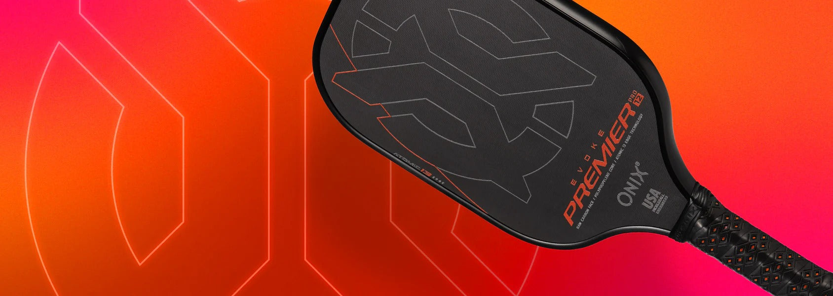 Available in orange and pink and 4 different sizes, the Evoke Premier Raw Carbon paddles increase traction on the ball for maximum spin and control without sacrificing any pop or power. The polypropylene core provides a lightweight and durable paddle with excellent all-around maneuverability. This lightweight pickleball paddle is also constructed with a non-slip, comfort grip that makes it easy to control on the court. These paddles are used by many pro players, including multiple Team ONIX professional players, across the country. This paddle is a new-found fan favorite tournament paddle.